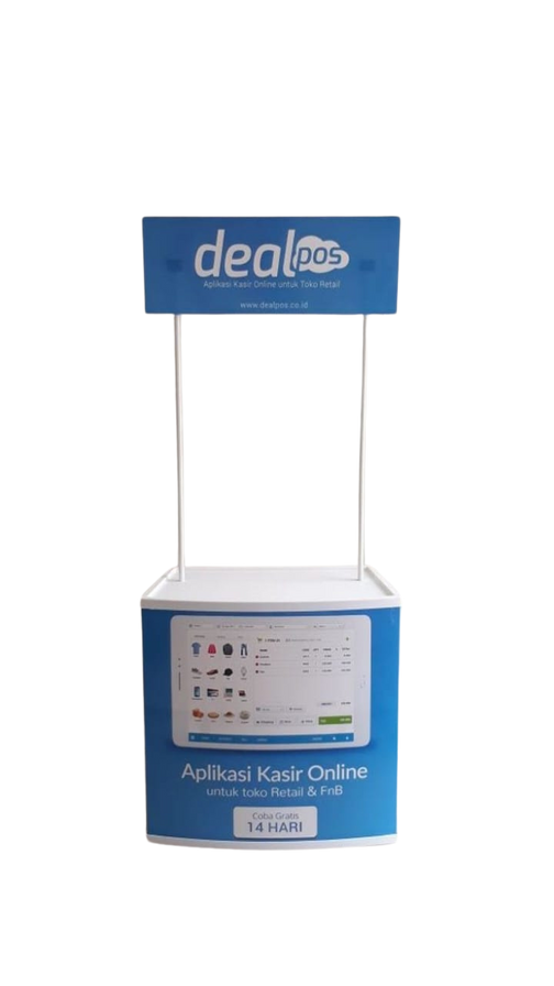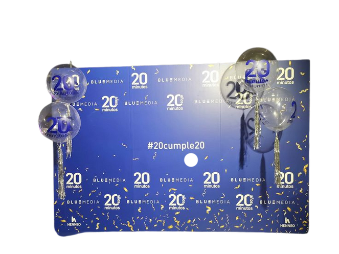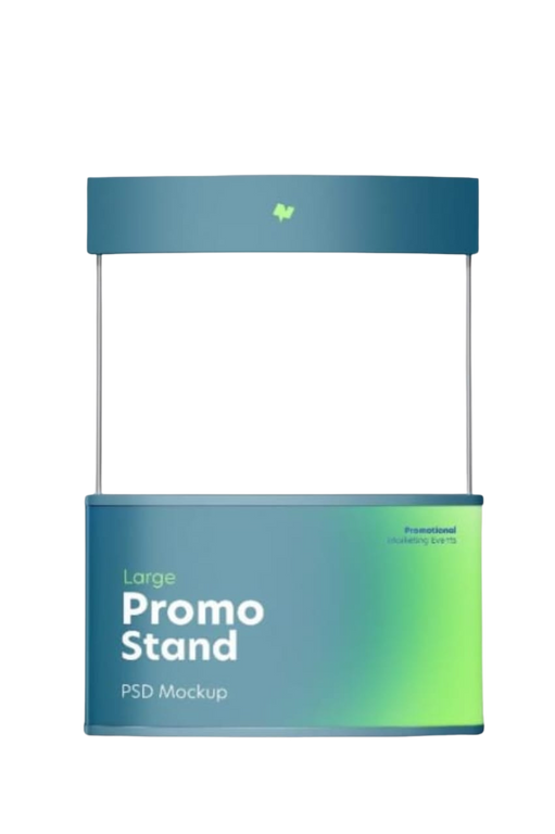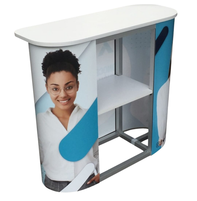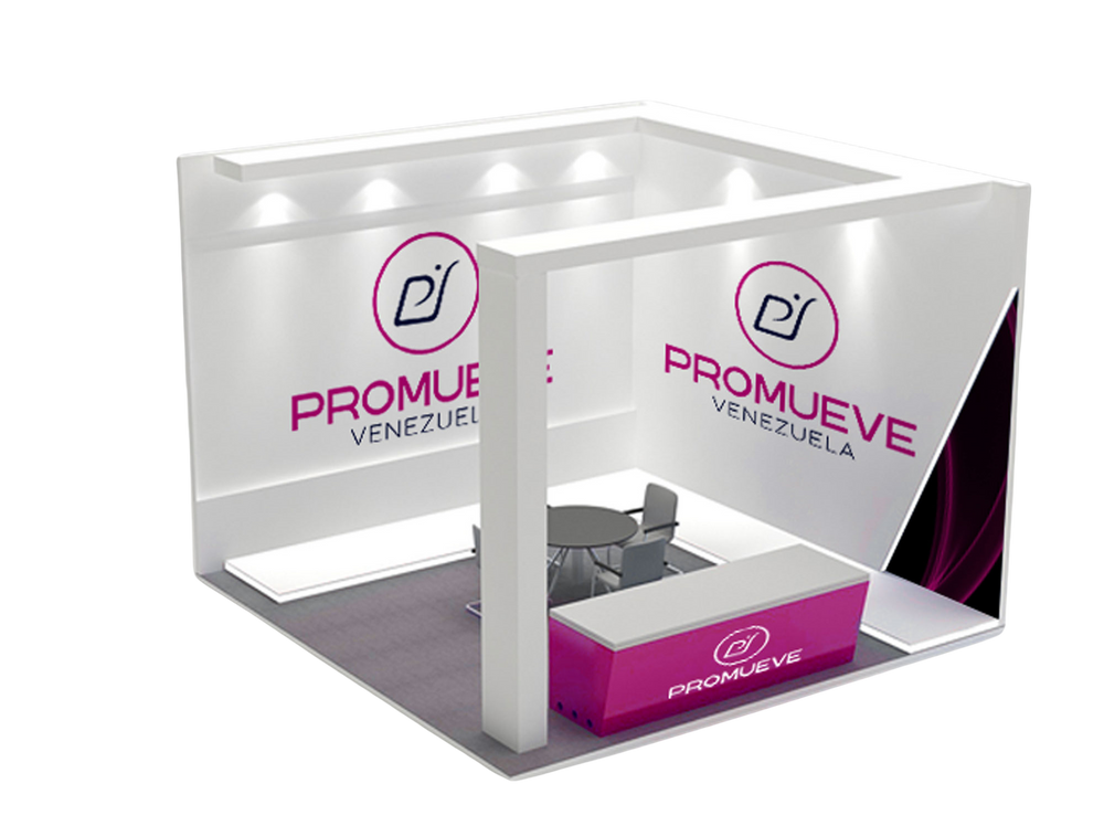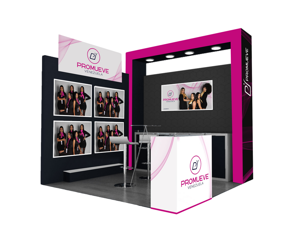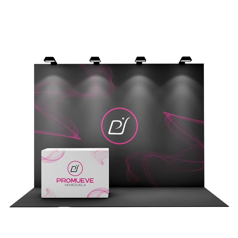 Tensado con banner en alta resolución o rotulado con vinil mate o brillante, con una mesa y dos sillas, podio de